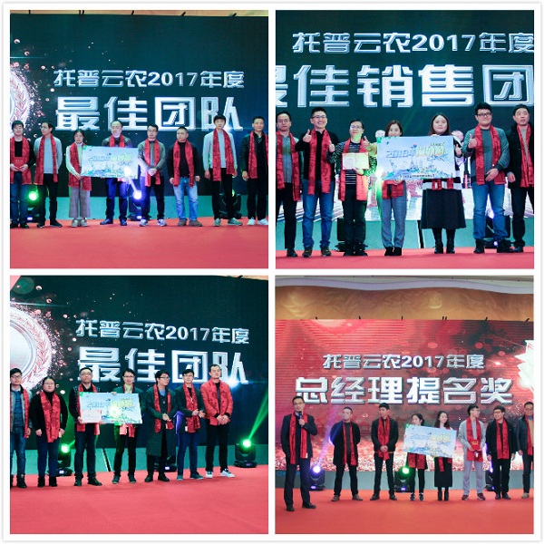 農(nóng)業(yè)信息化是農(nóng)業(yè)現(xiàn)代化發(fā)展的基礎。過去一年,托普云農(nóng)在農(nóng)業(yè)信息化的道路上屢獲農(nóng)業(yè)部門和行業(yè)的認可。憑借前沿的技術研發(fā)與落地應用能力,先后榮獲世界物聯(lián)網(wǎng)博覽會、匠農(nóng)杯等業(yè)內大獎。在榮耀的成績背后,離不開一大批優(yōu)秀員工和團隊的辛勤付出。針對2017年表現(xiàn)突出的團體和個人,現(xiàn)場頒發(fā)出年度銷售精英、創(chuàng)新改善、優(yōu)秀員工獎、最佳新銳獎等個人獎項以及最佳團隊、總經(jīng)理提名等團隊類獎項。