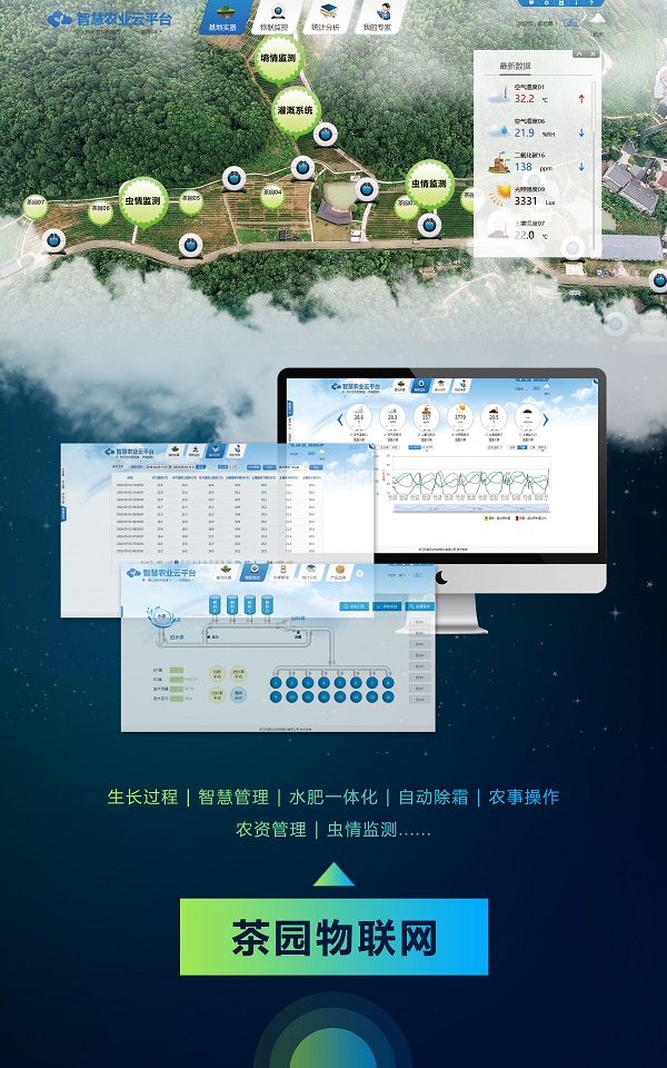茶園物聯(lián)網(wǎng):生長過程,智慧管理。水肥一體化、自動除霜、農(nóng)事操作、農(nóng)資管理、蟲情監(jiān)測......