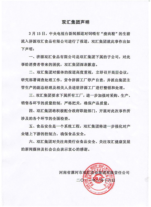 該聲明稱,雙匯集團(tuán)對媒體的報道高度重視,立即召開高層會議,研究部署調(diào)查處理工作,責(zé)令濟(jì)源工廠停產(chǎn)自查,并派出集團(tuán)主管生產(chǎn)的副總經(jīng)理及相關(guān)人員進(jìn)駐濟(jì)源工廠進(jìn)行整頓和處理。雙匯集團(tuán)同時要求下屬所有工廠,進(jìn)一步加強(qiáng)對采購、生產(chǎn)、銷售各環(huán)節(jié)的質(zhì)量控制,嚴(yán)格把關(guān),確保產(chǎn)品質(zhì)量。與此同時,雙匯集團(tuán)將積極配合政府職能部門,開展對此次事件所涉及的各個環(huán)節(jié)的全面檢查。