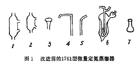 我國(guó)現(xiàn)在使用的食物營(yíng)養(yǎng)成分的數(shù)據(jù)多是40年代或50年代前測(cè)定并收集整理的,而且所收集的品種也不多。近年來(lái)我國(guó)不僅自己又培育出許多新品種,而且還從國(guó)外引進(jìn)了一些品種,另外還淘汰了一些老品種。為了了解食物中的營(yíng)養(yǎng)成分,目前我國(guó)許多地方和部門都逐漸開展起有關(guān)食品營(yíng)養(yǎng)成分的調(diào)查研究工作。我們知道,對(duì)食品中(例如干、鮮水果,魚、肉等)蛋白質(zhì)的分析濺定是一項(xiàng)必不可少的分析指標(biāo)。在分析中所接觸到的市售的微量定氮儀蒸餾器,大家普遍反映不好傭,其主要問(wèn)題是(1)不好對(duì)容器進(jìn)行清洗;(2蒸出物無(wú)法冷凝。微量定氮蒸餾器如圖1所示。