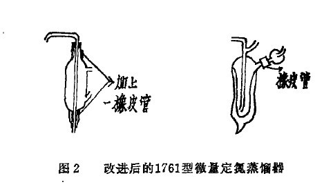 在實(shí)際工作中,我們應(yīng)該對(duì)該套蒸餾裝置進(jìn)行了二點(diǎn)小改進(jìn)。(1)將圖1中的6號(hào)裝置的球與管連接處用玻璃刀隔開,然后用一根橡皮管連接起來(lái)。(2)將4號(hào)裝置裝到1號(hào)裝置中,兩頭用橡皮管和粘合劑固定住。改進(jìn)后的定氮裝置如圖2所示。經(jīng)我們改進(jìn)后的微量定氮裝置經(jīng)實(shí)際應(yīng)用后,完全克服了原有蒸餾器的缺點(diǎn)而且效果很好。