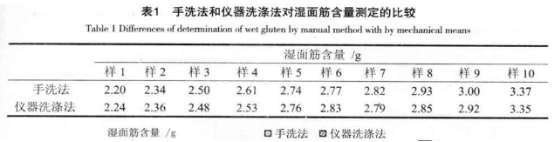 一、手洗法與單頭面筋洗滌儀對小麥粉濕面筋的影響