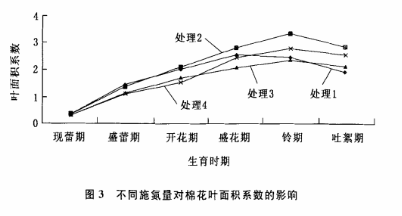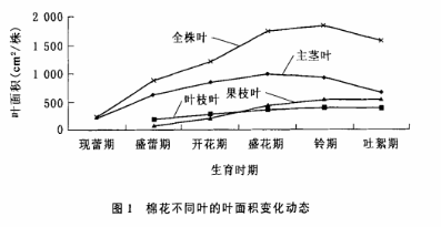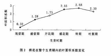 通過excel數(shù)據(jù)統(tǒng)計分析軟件可得出,高產(chǎn)雜交棉的葉面積系數(shù)的發(fā)展動態(tài)符合方程y=-0.1437x²+1.4332x—1.0249,相關(guān)系數(shù)R²=0.9744,根據(jù)研究表明,葉面積系數(shù)的發(fā)展動態(tài)呈拋物線變化,這與我們研究的相一致,通過研究表明,葉面積系數(shù)與單株葉面積在整個生育期的動態(tài)變化是一致的,均符合一元二次方程,這從圖1和圖2中可以看出,在鈴期以前,雜交棉的葉面積系數(shù)隨著生育進(jìn)程的推進(jìn)在不斷地增大,進(jìn)入鈴期以后,隨著生育進(jìn)程的推進(jìn),手持葉面積儀測量的葉面積系數(shù)開始下降,其葉面積系數(shù)在鈴期達(dá)到最大值,為2.68。在現(xiàn)蕾期葉面積系數(shù)比較小,進(jìn)入現(xiàn)蕾期以后,葉面積系數(shù)的發(fā)展加快,由現(xiàn)蕾期的0.32發(fā)展到盛花期的2.55;盛蕾期到盛花期近乎直線增長,至鈴期達(dá)高峰,以后開始下降,到吐絮期,葉面積系數(shù)尚在2.30。