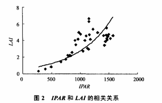 經(jīng)過(guò)光合有效輻射記錄儀的研究分析并結(jié)合表1,我們可以得知,表1為不同播種期和播種量對(duì)小麥冠層截獲光合有效輻射量的影響。從小麥整個(gè)生育期來(lái)看,光合有效輻射量呈現(xiàn)拋物線形,與LAI的變化相同,小麥的各生育時(shí)期,隨著播種期的推遲,光合有效輻射記錄儀測(cè)量的光合有效輻射量呈減小趨勢(shì)。光合有效輻射量和葉面積指數(shù)呈現(xiàn)相同的變化趨勢(shì),即LAI大的小麥群體,有利于冠層截獲光合有效輻射。而圖2是不同播種期小麥各生育期的光合有效輻射量與葉面積指數(shù)的相關(guān)關(guān)系圖(n=36),可以看出光合有效輻射量和葉面積指數(shù)呈指數(shù)正相關(guān)關(guān)系。