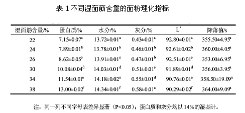 根據(jù)國(guó)標(biāo)GB8607-1988和GB8608-1988規(guī)定,面粉濕面筋含量低于24%為低筋面粉,高于30%為高筋面粉,濕面筋的含量可用單頭面筋測(cè)定儀進(jìn)行測(cè)量。不同濕面筋含量面粉理化指標(biāo)分析見表1。