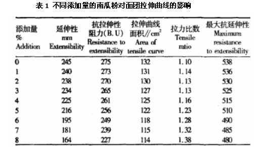 南瓜粉就是將南瓜進行加工制作而成的粉末,南瓜粉含有豐富的蛋白質(zhì)、膳食纖維、維生素等營養(yǎng)元素,適量的使用對人體十分有好處。有研究表明,南瓜粉不僅具有舒筋活血及防止皮膚破裂和防癌等作用,同時還助于人體發(fā)育、增強人體內(nèi)的免疫等功能,因此,南瓜粉被廣泛應用于天然保健營養(yǎng)品。本文通過電子拉伸儀研究不同南瓜粉的添加量對面團拉伸曲線的影響。