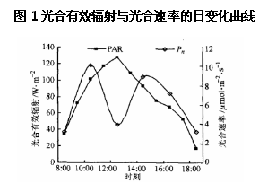 作物的光合作用是作物生長過程中物質積累與生理代謝的基本單元,自然條件下植物的光合作用隨著內(nèi)外因子的變化而時刻發(fā)生變化,而光合有效輻射是植物進行光合作用的重要能源。以2007年9月19日測定的光合速率p n和光合有效輻射日變化代表,如圖1所示。